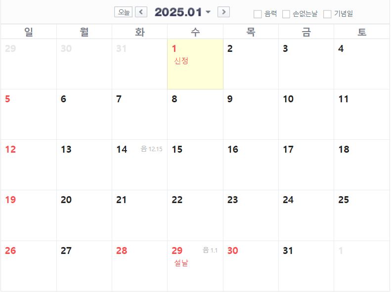 1월 : 신정(1월 1일 수요일) , 설날 연휴 3일(1월 28일 화요일 ~ 30일 목요일)