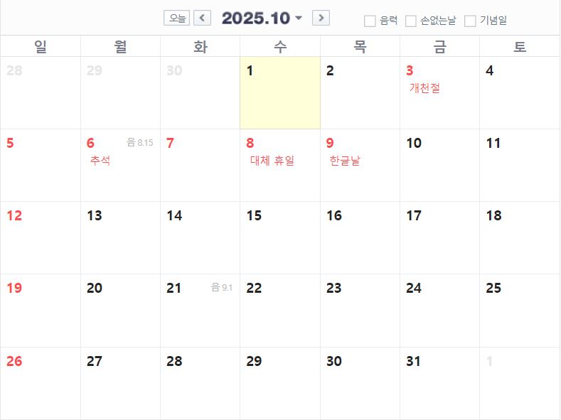 10월 : 개천절(10월 3일 금요일), 추석(10월 5일 월요일 ~ 8일 목요일), 한글날(10월 9일 목요일)