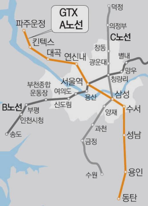 GTX는 수도권광역급행철도의 약자로, 기존 지하철보다 훨씬 빠른 속도(최대 시속 180km)로 이동할 수 있는 초고속 철도입니다. 일반 지하철은 평균 시속 30~40km에 불과한데요, 이에 비해 GTX는 엄청난 속도의 광역 급행인 것이죠.